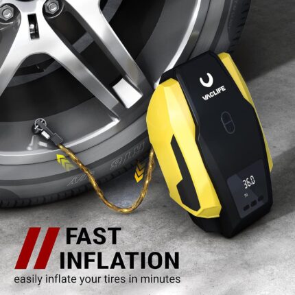 [FAST INFLATING & EASY OPERATION] This auto tire air compressor can inflate your standard car tires in seconds. Plug it