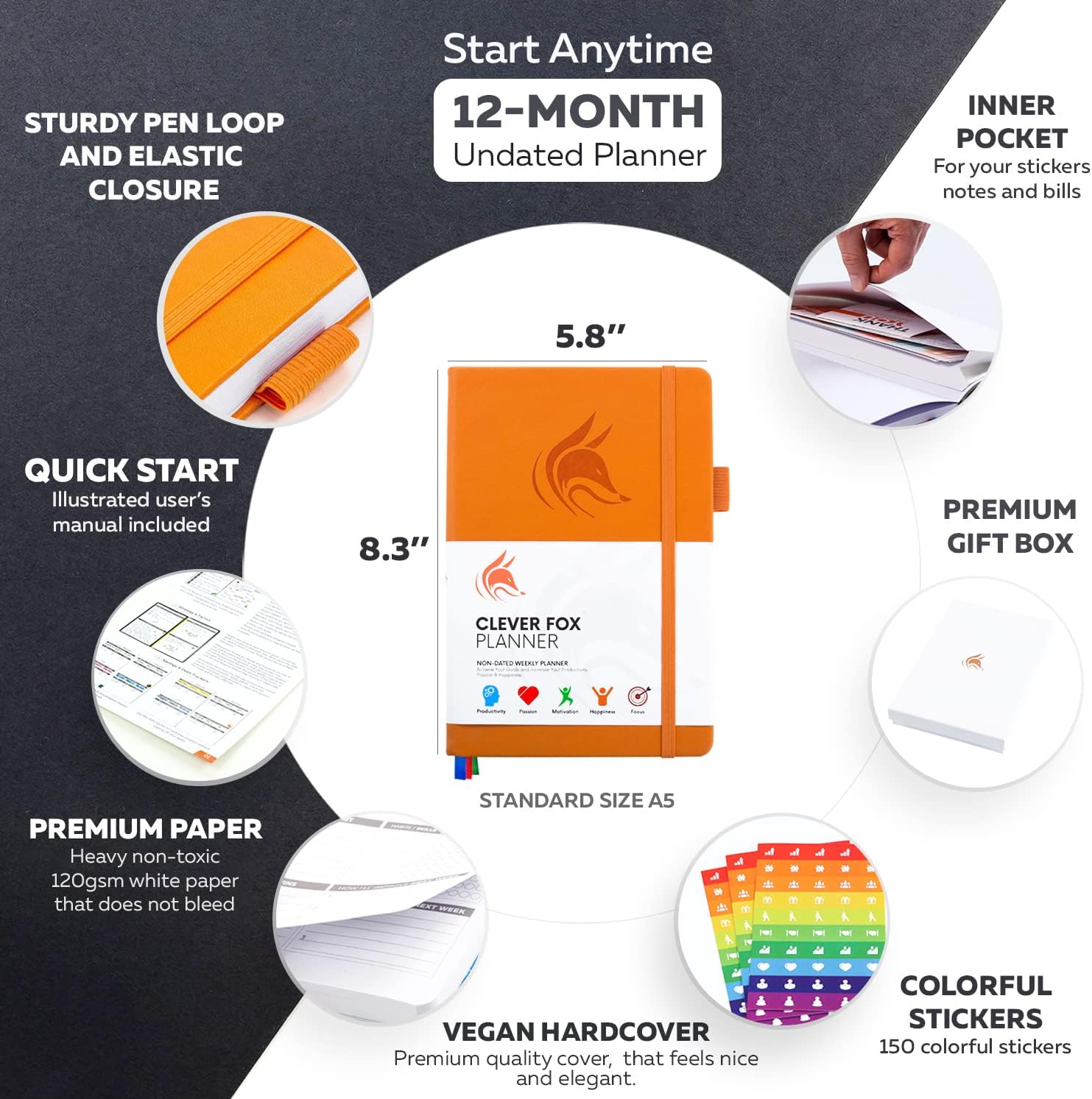 • FREE QUICK START GUIDE & STICKERS – This planner and organizer for women and men comes with a detailed step-by-step illustrated user guide for a quick start, unlike other planners that will leave you wondering how to use them after the purchase. It also comes with 150 colorful planner stickers and in a premium gift box keepsake packaging. There is absolutely no reason for you to look any further. Clever Fox planner is guaranteed to work, or we will give you your money back!