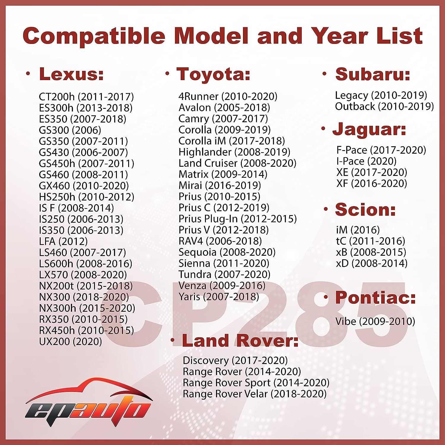• Replacement for FRAM CF10285, Replacement for Toyota Genuine Part# 87139-02020, 87139-02090, 87139-06040, 87139-06080, 87139-07010, 87139-07020, 87139-08030, 87139-0D010, 87139-0D070, 87139-30040, 87139-30070, 87139-47010, 87139-47010-83, 87139-48020, 87139-50060, 87139-50100, 87139-52020, 87139-52040, 87139-60020, 87139-76010, 87139-YZZ08, 87139-YZZ10, 87139-YZZ16, 87139-YZZ20