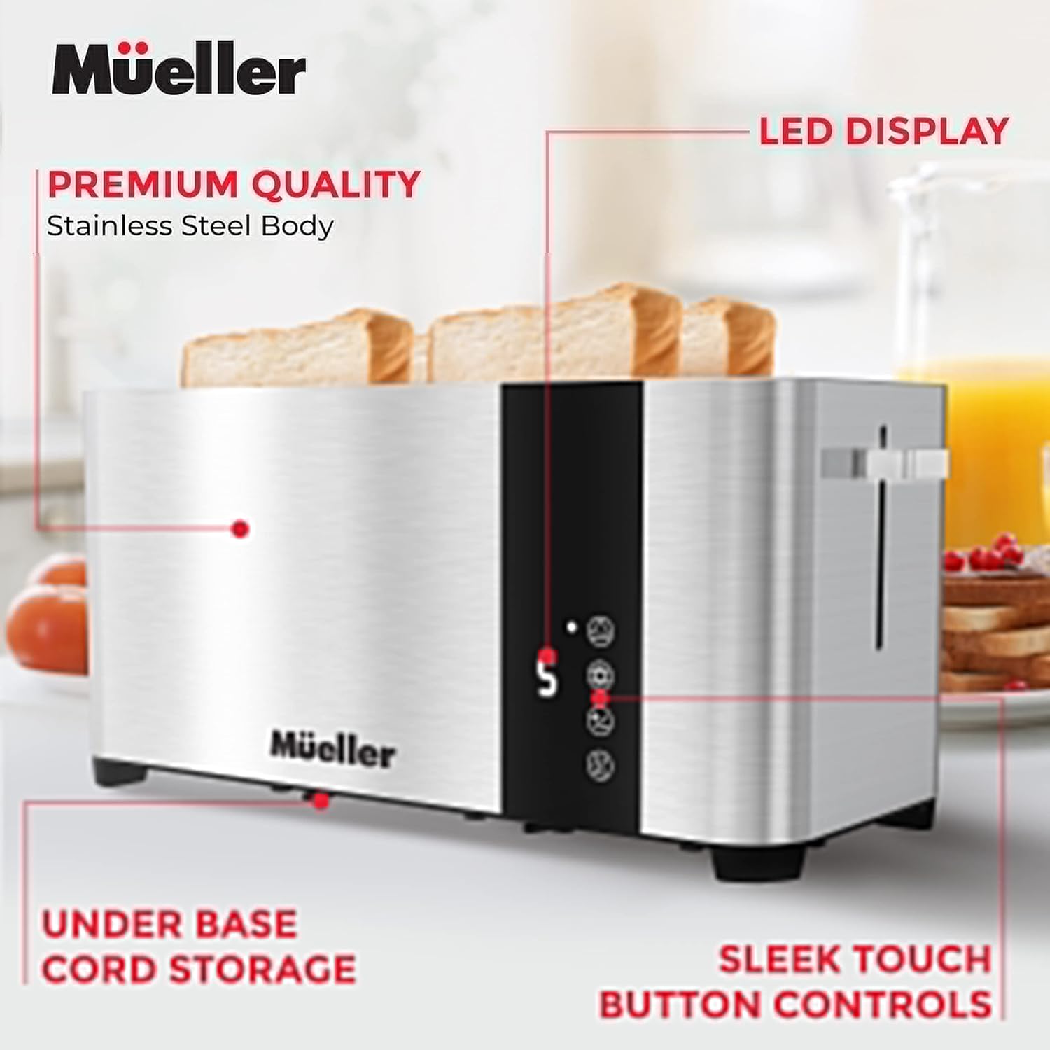 • Multifunctional Toaster – Kickstart your mornings with fresh toast or perfectly warmed bagels with the Mueller UltraCrisp 4 Slice Toaster. Features Cancel, Defrost, and Reheat functions, self-centering slot guides, and intelligent heating technology to deliver even toasting every time!